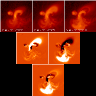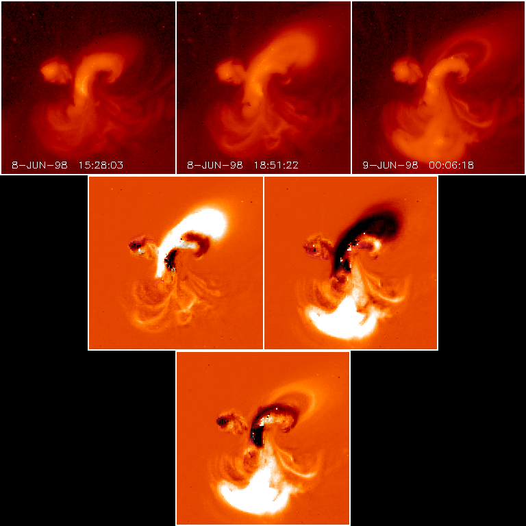 Top row, the real data; middle row, the running differences; bottom row, a full difference. That is, top line shows images 1, 2, and 3; the middle line shows 2 minus 1 and 3 minus 2, and the bottom image is 3 minus 1. Dark represents a deficit and bright represents an excess in each case. Running differences are tricky and often cause headaches, but normalizing them this way seems to show the following: the flare served to inflate the sigmoid, and the slow GOES event that followed the flare represented the formation of the post-flare loop system (the bright structure in the S). The disappearance of the sigmoid left its negative representation in the full difference image (bottom) - can this be interpreted as "transient coronal holes" following a flux-rope ejection, or is there something more complicated here?