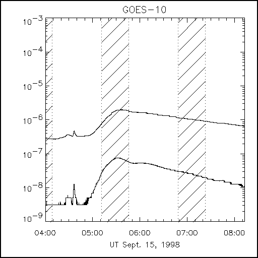 Interestingly enough, there was little hint of meter-wave activity during this major event. We might have expected type II and type IV emission. At the time of writing, no data were available from CGRO - Yohkoh's own hard X-ray instrument was blind during the interesting part of this event because of the poor timing of day and night (orbit night intervals for Yohkoh shown here as hashed regions):