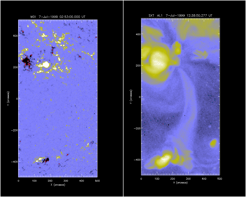 But how does the reconnection proceed, what drives it, and what are its consequences? We note from previous nuggets that the NS loops show up quite well in Yohkoh/SXT images, which immediately implies high temperature and suggests a signature for the reconnection. S. Tsuneta suggested that loops rising from active regions could drive the reconnection. Do this week's remarkable observations fit this idea?