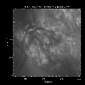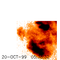 The left-hand image below is a Full-resolution SXT frame from 06:00:36 UT, during the rise phase of the flare. It faintly shows the arcade, primarily displaying the bright footpoints. In the right-hand image the intensity measured from the first image is overlaid onto a map of the temperatures in the region (actually the log of the temperature, linked below). The structures which are brightest in the SXT intensity image (contours in the overlay) appear to be cooler than some of their surroundings. Some but not all of this is due to instrumental effects (like scattering of photons within the telescope, which has not been corrected in the making of this temperature map); therefore the reader is cautioned not to believe any of the log-temperatures higher than 7.2. But notice in particular the interesting appearance of a temperature gradient in the small loop on the left-hand side of the frame (plotted at coordinates x=600, y=200 in the intensity image).