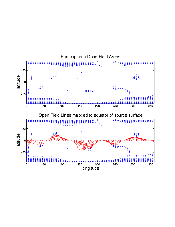 plot of open field lines as above, but only those mapping to the source surface equator at 2.5 Rs (note in the central meridian region the solar wind source switches from the North to South hemisphere)