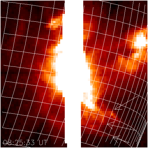 One can see from the time labels that the excitation of this feature lags behind the time of ejection, which matches the time of the impulsive hard X-ray burst typically well. Please see the MOVIE to get the time relationships straight. According to NOAA's Gopher service, the Type II burst started at 08:27. The feature flares up and bends as though to follow the blast emanating from the flare core. Other features at comparable distances show no effect! This is typical behavior for a flare; catastrophic changes in the emitting material, and often no dynamics at all in nearby features. From this one concludes that some parts of these regions must have much higher magnetic pressure than gas pressure.