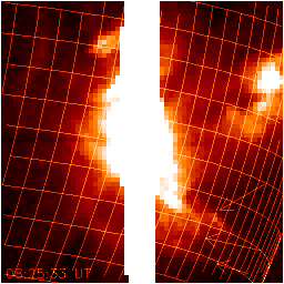 The arrows at the lower right point to bits of the stuff flying away from the flare core. They are going to the lower right, and disk center is at the upper left. The flare core is amazingly compact, as is often the case for these very impulsive events, and has a density approaching 10^12/cm^3. The image on the right above shows a blown-up view of flare maximum in soft X-rays: the image on the left has a width 128 pixels, and the one on the right only 8! Each pixel is about 2,000 km on the Sun.