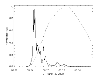 A "sympathetic flare" is one resulting from a perturbation caused by another flare. On March 2 we had our second X-class flare of the year 2000, and it displayed powerful ejecta that clearly perturbed some nearby structures but not others. Here's a summary plot of the light curves, GOES soft X-rays (1-8 A) and Yohkoh HXT hard X-rays (33-53 keV; the soft X-rays, the dotted line, appear to integrate the hard X-ray light curve - the Neupert effect: