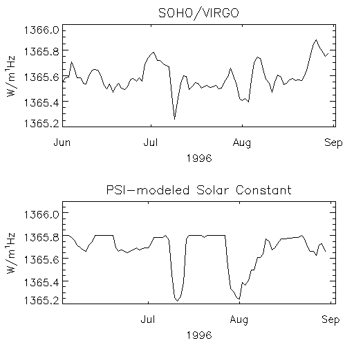There are several interesting things here. First, the PSI model doesn't show all of the observed fluctuations. That's partly because it depends upon sunspots being there, but this is a three-month period during solar minimum - sometimes no spots! Second, the first apparition of the July spot group correlated well (spots on the solar central meridian about July 10), but the second didn't (same group of spots on the central meridian about August 1). Spots are black, so PSI can only model the negative excursions; the faculae dominate the positive excursions but aren't in the PSI model.