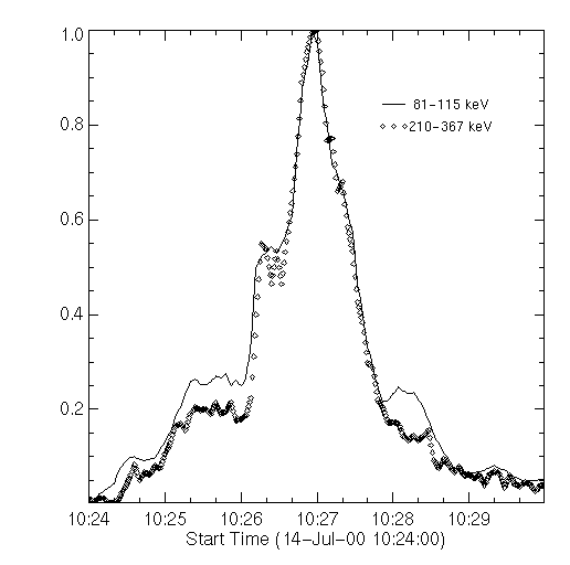 Because I do not really know the performance of HXS, I cannot present a hard X-ray spectrum from the instrument. But I can probably estimate the background level from each channel and compare the background-subtracted time profiles at different energies. Here is an example from the Bastille Day 2000 flare. This plot, normalized to the peak of each energy band, shows that the decay time is similar at the two energies, i.e., no progressive hardening. Although I have not completed a systematic study, it appears that none of the X-class flares observed by Yohkoh show a soft-hard-harder pattern. Does the occurrence of gradual hard flares depend on solar cycle?