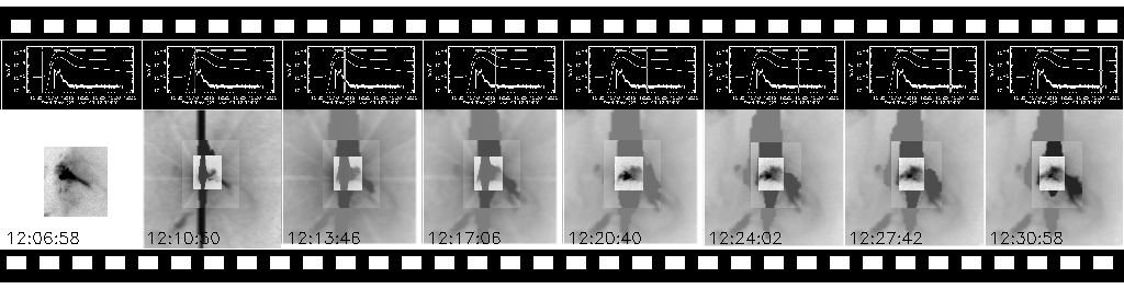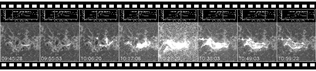 But there seem to be other cases where ejections in the early phase of the flare may indicate the relation with CME shocks. Look at the following movie for the Bastille Day 2000 event in the TRACE UV channel. We see a moving front ahead of the eruptive filament as early as 10:08 UT, with their legs appearing brighter. This front seems to be the earliest manifestation of the CME shock, and by moving westward from W07 as it accelerated particles it may have intersected the field lines connecting to the Earth at an early stage of the CME propagation. This example indicates that some of our flare ejections may represent the early manifestation of CME shocks and that their directions may be important in predicting the rising phase of SEP events.