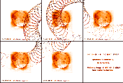 Ephemeris calculations for the solar eclipse of May 10, 1994, as seen by Yohkoh. The circles show the positions of the lunar limb every two minutes, with the times of closest approach for each of the five episodes marked on the images. The dotted circles correspond to times to "double eclipses" - both the Moon and Earth lie between Yohkoh and the Sun. The reference image is from about four days before the actual eclipse event. Submitted by Hugh Hudson, 7 May 1994